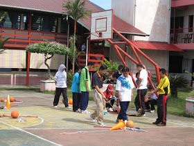 Guru besar dengan guru-gurunya sedang menyiapkan kelengkapan untuk acara permainan seterusnya.Ini bermaksud para guru perlu juga aktif bersukan.
